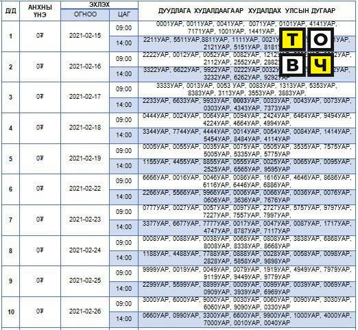 Тодруулбал, Зам тээврийн хөгжлийн сайдын 2020 оны арваннэгдүгээр сарын 18-ны өдрийн А/222 тоот тушаалаар батлагдсан “Автотээврийн хэрэгслийн бүртгэл хөтлөх улсын дугаар олгох журам”-ын хүрээнд тээврийн хэрэгслийн улсын бүртгэлийн дараах дугааруудыг худалдах нээлттэй цахим дуудлага худалдааг зарласан байна.