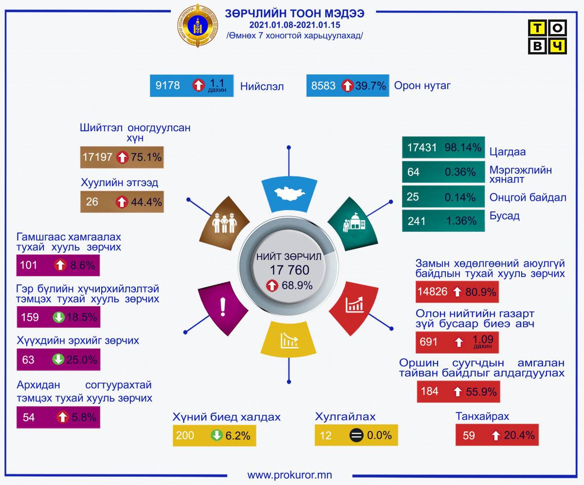 Энэ оны 1 дүгээр сарын 08-ны өдрөөс 1 дүгээр сарын 15-ны өдөр хүртэлх хугацаанд улсын хэмжээнд гарсан зөрчлийн тоон мэдээг өмнөх долоо хоногтой ЭНД харьцуулахад нийт 17760 зөрчлийн хэрэг бүртгэгдэж 68.9 хувиар өссөн бол Нийслэлд 1.1 дахин, орон нутагт 39.7 хувиар тус тус өссөн дүнтэй байна.