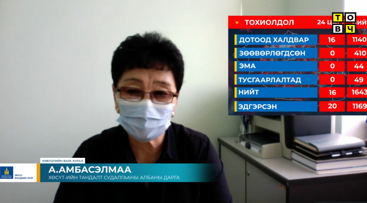 ЭМЯ-наас коронавирусний талаарх ээлжит мэдээллээ хийлээ. 2021 оны нэгдүгээр сарын 24-ны өдөр ХӨСҮТ болон Зооноз лабораториудад нийт 7065 шинжилгээ хийхэд 16 хүний шинжилгээнээс халдвар илэрчээ. Эдгээр батлагдсан тохиолдолууд нь өмнө нь ажиглан тусгаарлах байранд тусгаарлагдаж байсан иргэдийн 2 болон 3 дахь давтан шинжилгээгээр илэрсэн байна. Нийслэлд бүртгэгдсэн тохиолдол 814 болж байгаа бол улсын хэмжээнд бүртгэгдсэн тохиолдол 1140 болжээ.