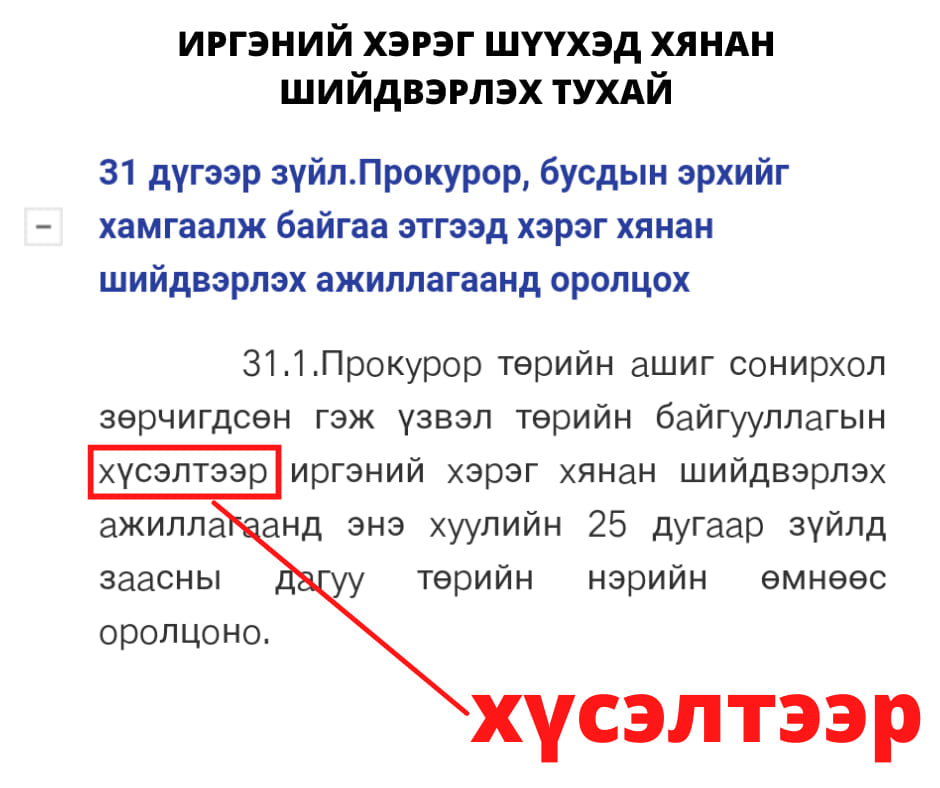 Иргэний хэрэг шүүхэд хянан шийдвэрлэх хуулинд зааснаар хэрвээ хариуцагчаар татаж байгаа тохиолдолд нэхэмжлэл гаргах хүсэлт гаргасан байгууллага байх шаардлагатай байдаг. Зүгээр Прокурорын хаа нэг шүүхэд хандаад хүсэлтгүйгээр маргаан үүсгэх боломжгүй. Хуулийн заалт нь энэ байна.