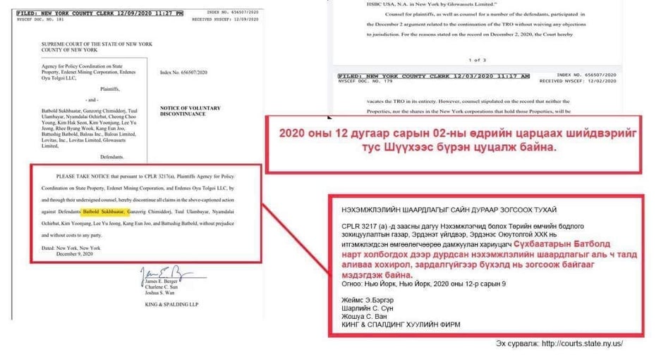 "Нэхэмжлэгч ба хариуцагчид 2020.11.30, 2020.12.22-нд эвлэрч, эвлэрлийг шүүхээс баталгаажуулжээ." Гэвч төрийн нэрийг барьсан хуурамч гомдол гаргасныг Нью-Йоркийн шүүхээс хэргийг Төрийн өмчийн бодлого, зохицуулалтын газар нэрийг хуурамчаар барьж маргаан үүсгэсэн хуулийн компани өөрөө татсан байна. Өөрөөр хэлбэл нэг сайтад бичиж байгаа шиг эвлэрүүлсэн эвлэрсэн зүйл огт байхгүй.