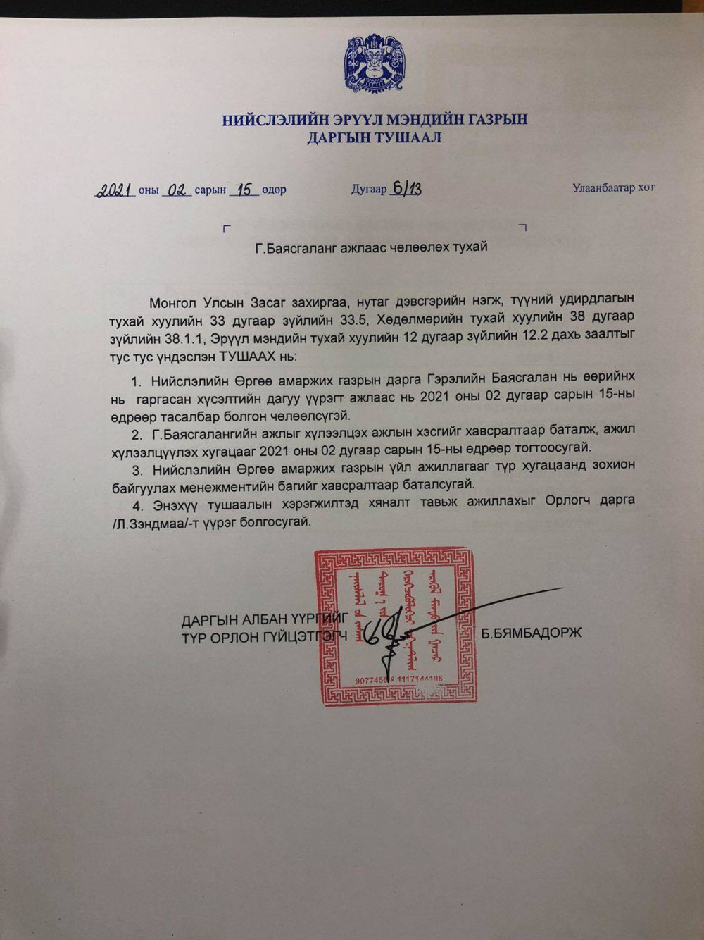 Нийслэлийн Эрүүл мэндийн газрын даргын тушаалын дагуу "Өргөө" амаржих газрын дарга Г.Баясгаланг үүрэгт ажлаас нь чөлөөлсөн. Энэ хүрээнд өнөөдөр Нийслэлийн Эрүүл мэндийн газраас томилогдсон менежментийн баг тус амаржих газарт ажиллаж байна. Менежментийн багт НЭМГ-ын удирдлага болон салбарын төлөөллүүд багтаж буй бөгөөд ажил хүлээлцэж, дараагийн дарга томилогдох хүртэл удирдлагын шинэ менежмент хийж ажиллах юм. НЭМГ-ын дарга Б.Бямбадорж иргэдийн эрүүл мэнд, эрх ашгийг нэн тэргүүнд тавих үүднээс эмнэлгийн ажилтнуудын харилцаа, хандлагыг засаж сайжруулах чиглэлд анхаарч, бусад улс орны үйлчилгээний соёлыг энэ салбарт нутагшуулахаар зорьж ажиллана гэдгээ тодотгосон юм.