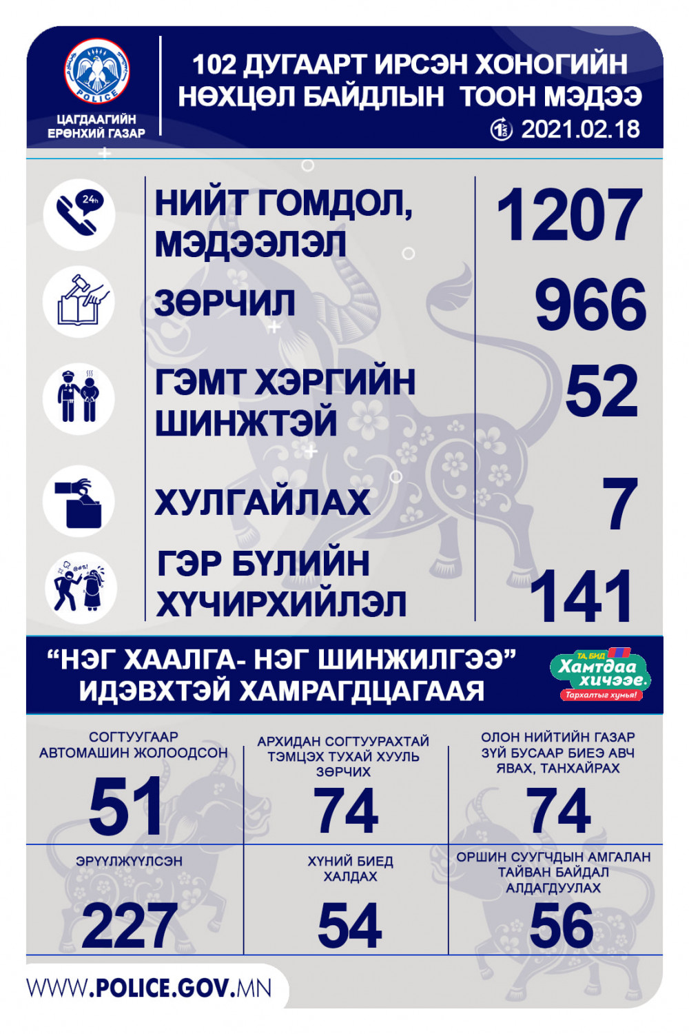 Үүнээс зөрчлийн дуудлага мэдээлэл 966, хулгайтай холбоотой 7, гэр бүлийн хүчирхийллийн дуудлага 141, гэмт хэргийн шинжтэй 52 мэдээлэл ирсэн байна.