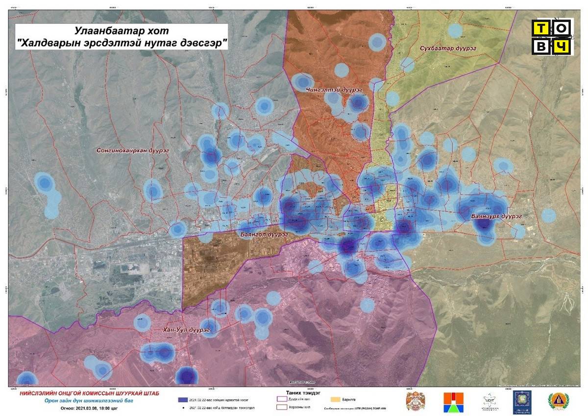 Нийслэлийн Онцгой комиссын Шуурхай штабын Орон зайн дүн шинжилгээний багийнхан илэрсэн халдварын тохиолдлуудыг мэдээллийн санд бүртгэж, тусгай аргачлалаар халдварын эрсдэлийн тархалт, нягтрал, чиг хандлагыг тооцоолж байгаа. Өмнөх сард хийсэн дүн шинжилгээтэй шинээр батлагдаж буй тохиолдлууд 90 гаруй хувиар таарч байна. Орон зайн дүн шинжилгээгээр цаашид коронавирусийн халдвар илрэх магадлал өндөр хороодыг танилцуулъя.