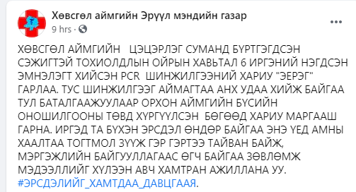 Хөвсгөл аймгийн Цэцэрлэг суманд бүртгэгдсэн COVID-19-ийн сэжигтэй нэг тохиолдлын ойрын хавьтал зургаан хүний PCR шинжилгээний хариу эерэг гарчээ. Уг шинжилгээ Хөвсгөл аймагт анх удаа хийж буй тул хариуг баталгаажуулахаар Орхон аймгийн Бүсийн оношилгооны төвд өчигдөр хүргүүлжээ. Эцсийн хариу нь өнөөдөр гарна хэмээн Хөвсгөл аймгийн Эрүүл мэндийн газраас мэдээллээ.