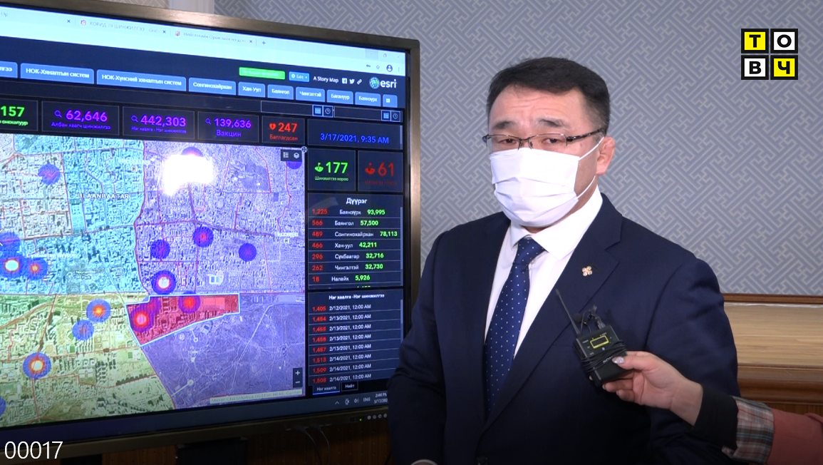 Тэрбээр "НОК-ын бүрэлдэхүүн 24 цагаар ажиллаж байна. Орон зайн дүн шинжилгээний төвийн тархвар зүйч, судлаач нар системд мэдээлэл оруулж, тархварын явц, аль дүүрэг, хороодоор халдвар илүү тархах өндөр магадлалтай байна вэ гэдгийг тооцооллын үндсэн дээр гаргаж ирж байна. Иргэд шинжилгээ өгөөд эрүүл гарахаар, эсвэл вакцинжуулалтын эхний тунг тариулаад дархлаа тогтоно гэж ойлгож болохгүй. Хоёр дахь тунг тариулснаас хойш 14 хоногийн дараагаас дархлаа тогтоно. Мөн иргэд амны хаалтаа зүүхгүй, гараа ариутгахгүй, хүн хоорондын зайгаа барихгүй байгаагаас болж бизнесийг нь дэмжих үүднээс үйл ажиллагааг нь эхлүүлсэн газруудад хүндрэл гарч байна. Вакцинжуулалтад Улаанбаатар хотын иргэдийг бүрэн хамруулж байж, 2021 оны хоёрдугаар хагасаас хэвийн амьдралдаа орохоор төлөвлөж ажиллаж байгаа.