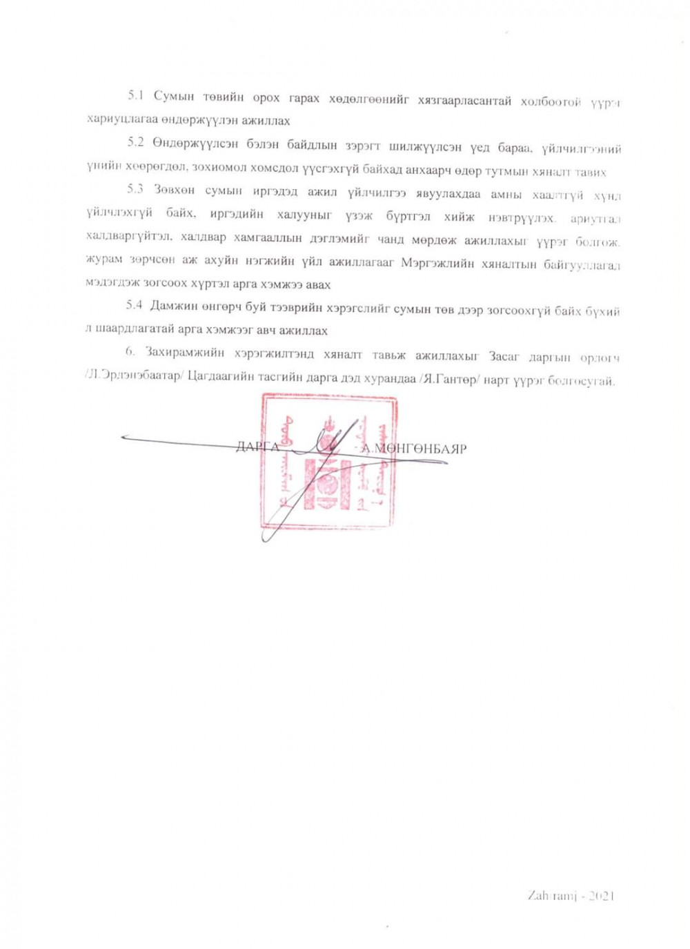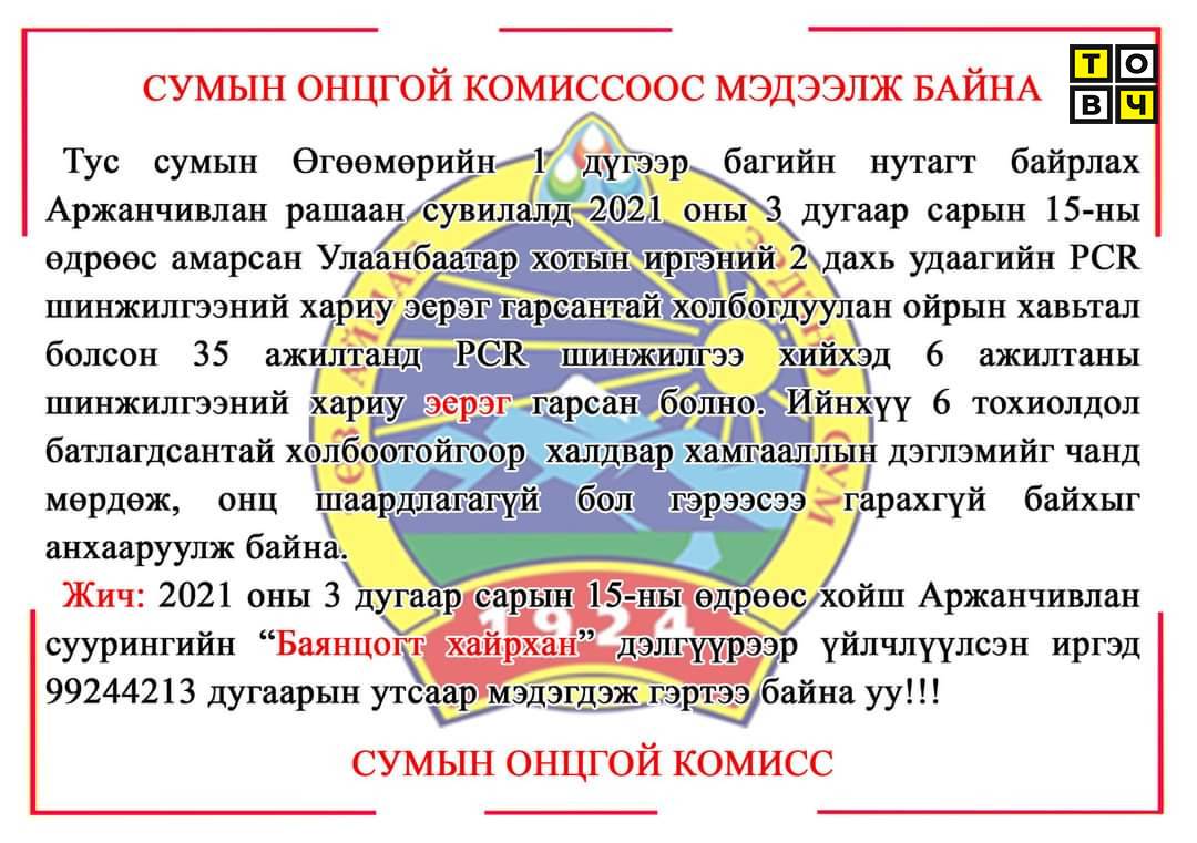 Өчигдөр /2021.03.20/ Төв аймгийн онцгой комиссоос коронавирусний халдварын тохиолдол нэмэгдэж 21 болсон талаар мэдээлсэн. Тодруулбал Мөнгөнморьт суманд ажилладаг замын компанийн нэг ажилтнаас коронавирус илэрсэн. Тэгвэл тус аймагт халдвар дахин бүртгэгджээ. Эрдэнэ сумын Аржанчивлан сувилалд хэвтэн эмчлүүлж байсан нэг иргэний давтан шинжилгээ эсрэг гарчээ. Улмаар ойрын хавьтлын 35 ажилтныг шинжилгээнд хамруулахад 6 ажилтны шинжилгээ эерэг гарсан байна. Тус суманд халдвар илэрсэнтэй холбогдуулан сумын шуурхай штаб хоёр хоногийн хатуу хөл хорио тогтоох шийдвэр гаргажээ.