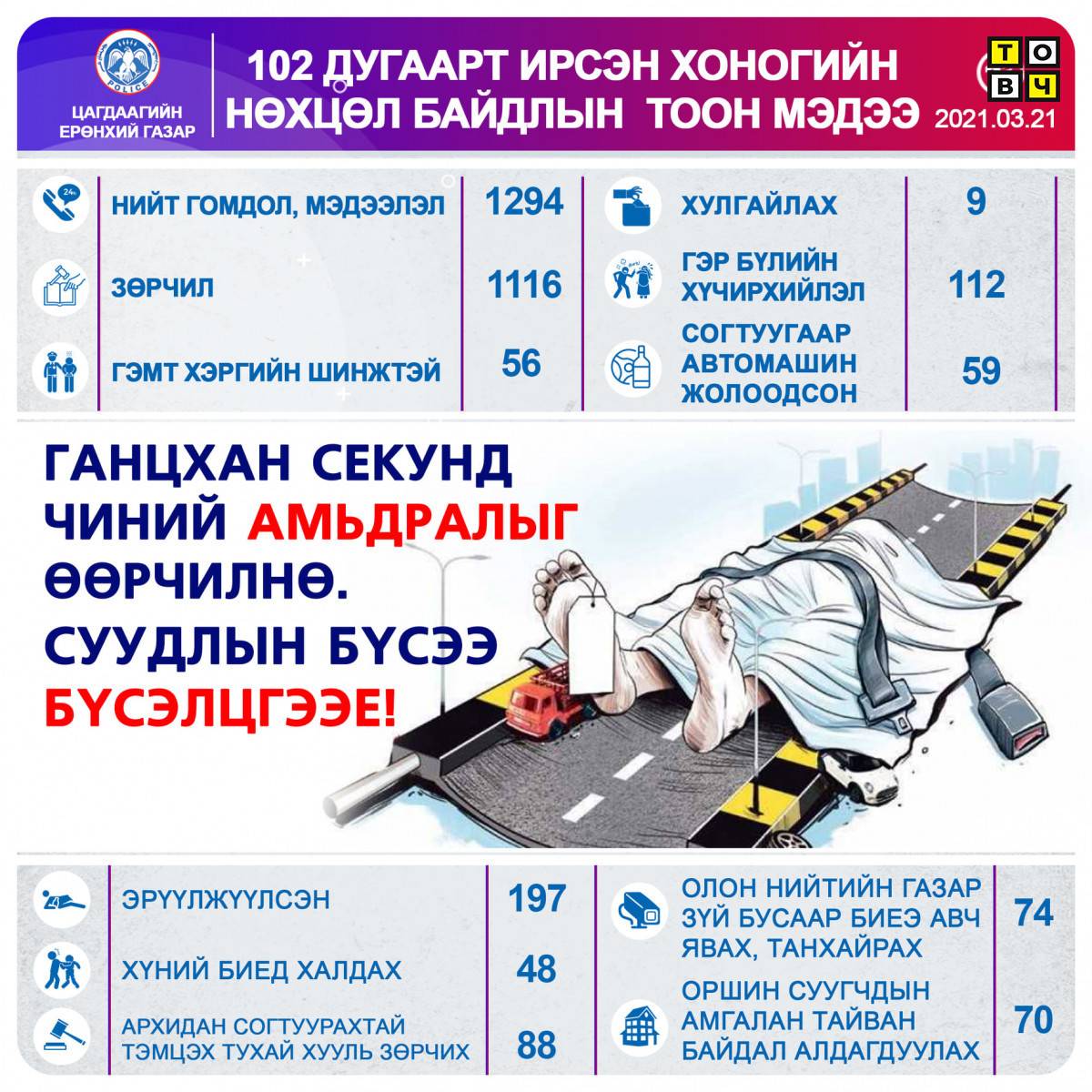Цагдаагийн байгууллагад 2021 оны 03 дугаар сарын 21-ний өдөр ирсэн дуудлага, мэдээлэл