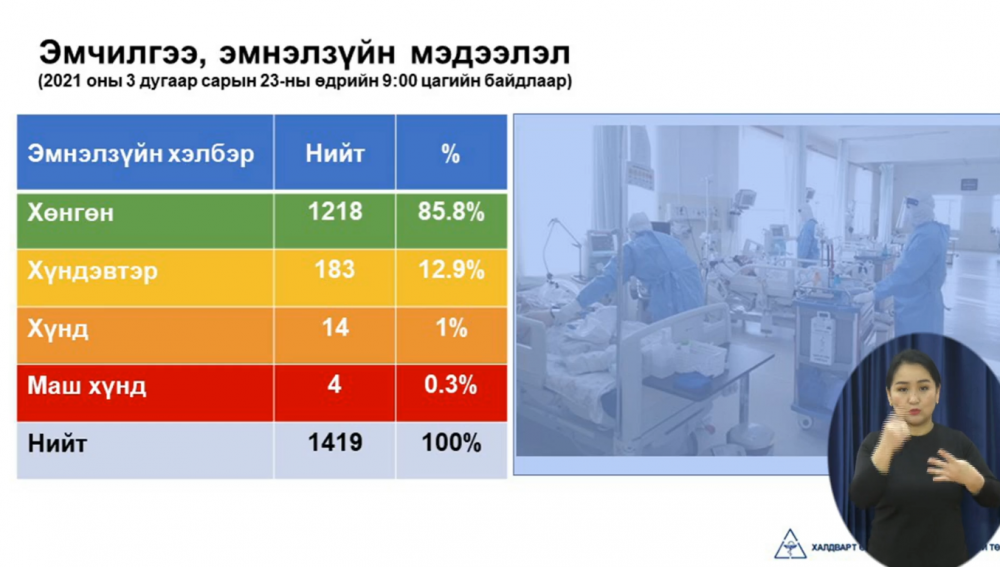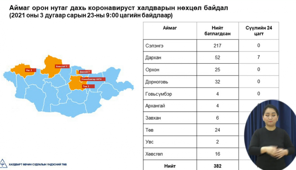 Эрүүл мэндийн яамнаас коронавирусний талаарх ээлжит мэдээллээ хийж байна. ХӨСҮТ-ийн албаны дарга Ж.Байгалмаа "2021 оны 3 дугаар сарын 23-ны өдрийн 09 цагийн байдлаар сүүлийн 24 цагийн хугацаанд нийт 12326 шинжилгээ хийснээс 206 тохиолдол бүртгэгдлээ. Үүнд Хөвсгөл аймагт 1, Дархан-Уул аймагт 7, Төв аймагт 3, Увс аймагт 2 тохиолдол шинээр бүртгэгдсэн байна. Улаанбаатар хотод өвчлөлийн тоо 4474 хүрсэн байна. Сүүлийн 24 цагийн хугацаанд 152 эмчлэгдлээ. Сайн мэдээ байна. Завхан аймгийн Шилүүстэй суманд бүртгэгдсэн батлагдсан тохиолдлууд бүгд эмчлэгджээ.