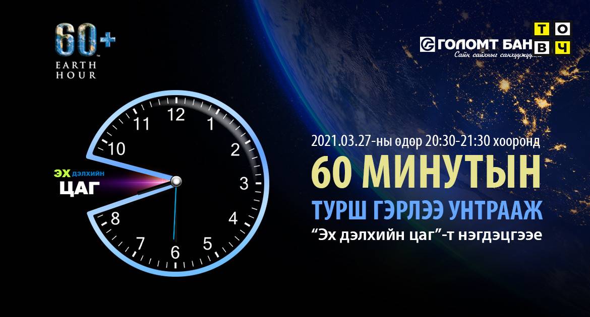 Дэлхий дахин “Эх дэлхийн цаг”-аар буюу жил бүрийн гуравдугаар сарын сүүлийн бямба гаригийн 20:30-д нэг цагийн турш нэгэн зэрэг гэрлээ унтраадаг. Үүний дагуу энэ жил 2021.03.27-нд буюу энэ Бямба гарагт уг өдөр тохиож байгаа бөгөөд 20:30-21:30 цаг хүртэл хүн бүрийг гэрлээ унтраан эх дэлхийн цагт нэгдэж, байгаль орчинд хувь нэмрээ оруулахыг уриалж байна. Бид гэрлээ унтраана. Харин та?