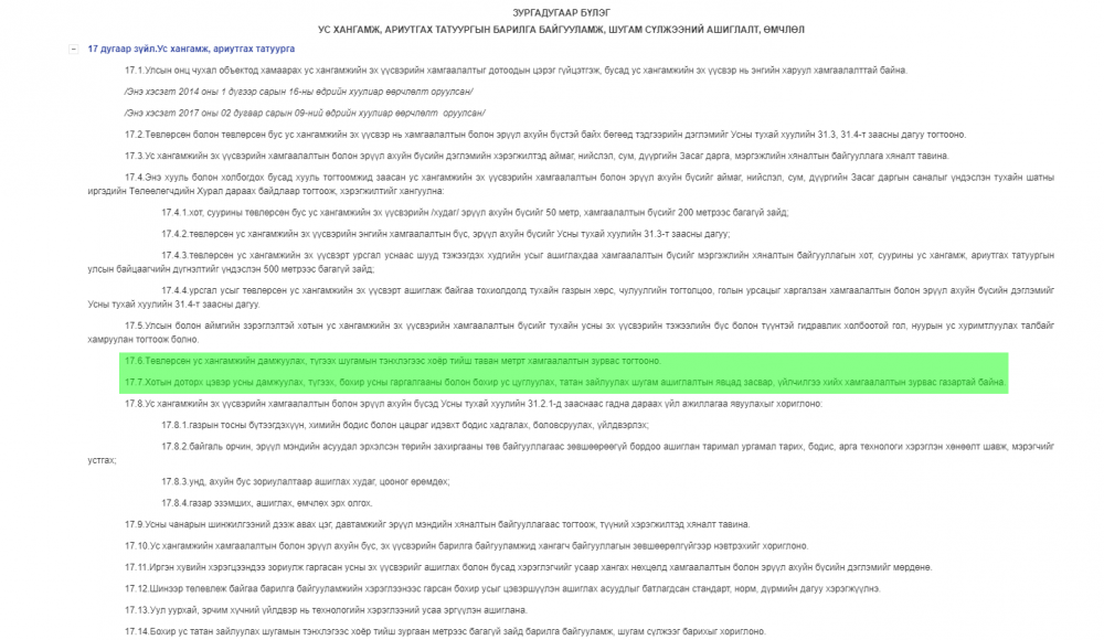 Хот, суурины ус хангамж, ариутгах татуургын ашиглалтын тухай хуульд барилга байгууламж нь хотын төвийн төвлөрсөн системээс 5,5 метрээс багагүй зайд баригдах ёстой. Гэтэл уг барилга бараг нийслэлийн хүн амын 60-70 хувийг цэвэр усаар хангадаг шугам дээр баригдаж байгааг УСУГ-ынхан хэлж байна.