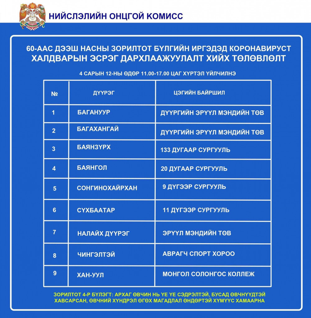 УОК-оос ирсэн чиглэлийн дагуу НОК, ДОК 60-аас дээш насны архаг хууч өвчтэй иргэдийг коронавирусийн халдварын эсрэг дархлаажуулалтад өнөөдрөөс хамруулж эхэлж байна. Дүүрэг бүрд дархлаажуулалтын нэг суурин цэгийг хоёр лайнтай нээж, зөвхөн 60-аас дээш насны архаг хууч өвчтэй (Эрүүл мэндийн 4-р бүлгийн) иргэдийг хамруулахаар төлөвлөсөн.