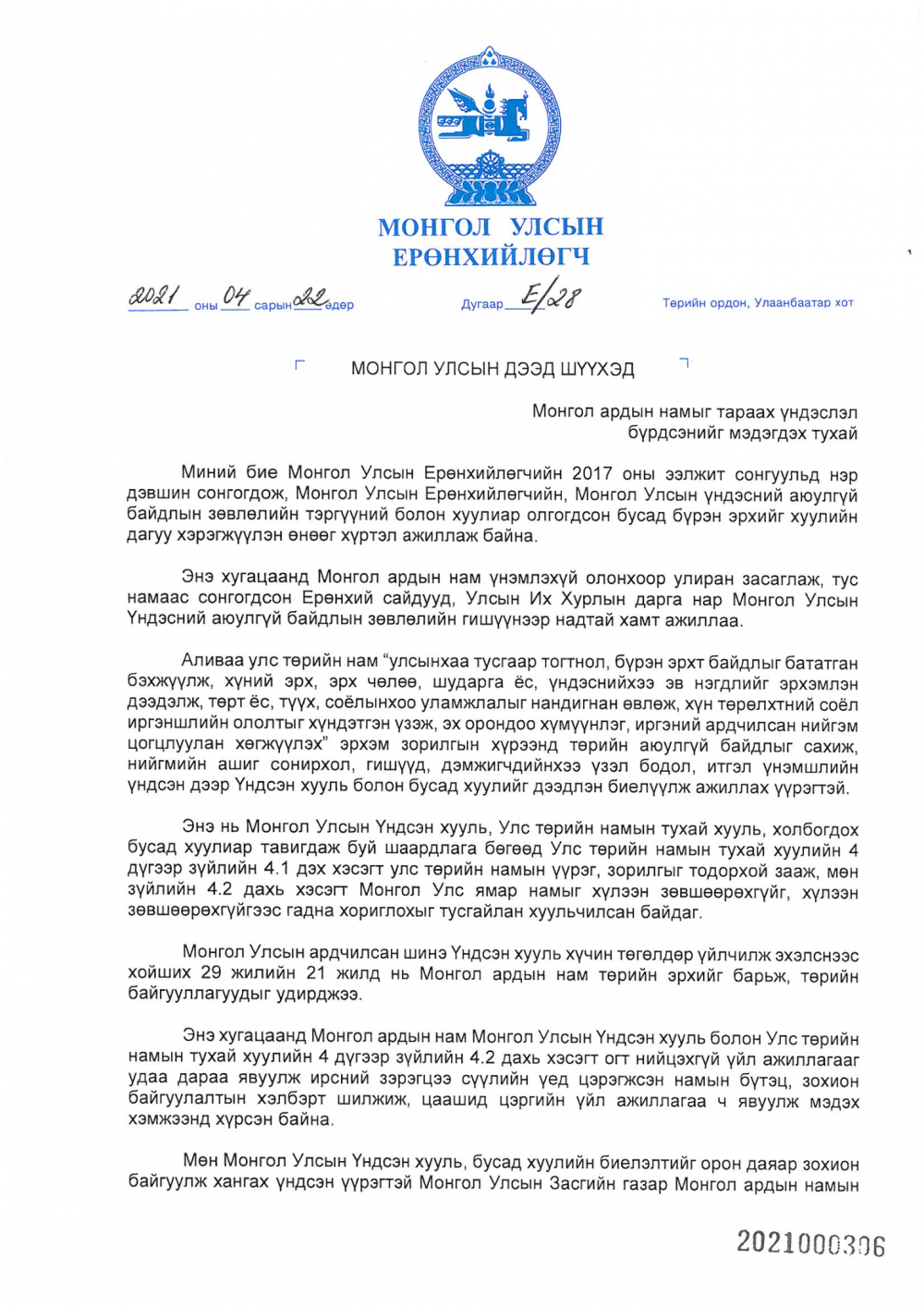 “МОНГОЛ АРДЫН НАМЫГ ТАРААХ ҮНДЭСЛЭЛ БҮРДСЭНИЙГ МЭДЭГДЭХ ТУХАЙ” МОНГОЛ УЛСЫН ЕРӨНХИЙЛӨГЧИЙН 2021 ОНЫ 04 ДҮГЭЭР САРЫН 22-НЫ ӨДРИЙН Е/28 ДУГААР АЛБАН БИЧИГ :