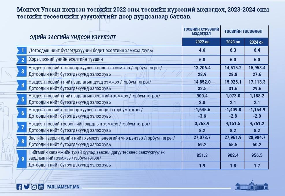 Нийгмийн даатгалын шимтгэлийг хоёр хувиар бууруулахыг дэмжиж, төсвийн хүрээний мэдэгдэл, төсвийн төсөөллийн тухай хуулийг баталлаа.
