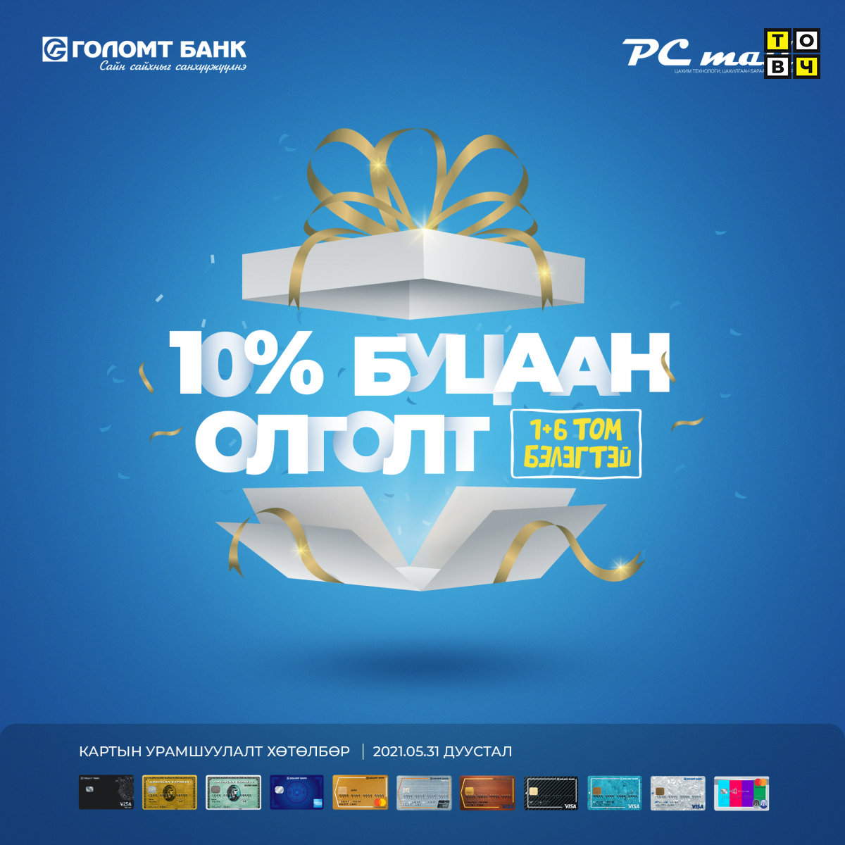 Голомт банк нийт карт эзэмшигчдэдээ зориулан урамшуулал, хөнгөлөлтүүдийг тогтмол зарладаг билээ. Тэгвэл энэ удаад та болон таны гэр бүлийн гишүүдийн хэрэгцээнд бүрэн нийцэх 10-21 хувийн буцаан олголт авах боломж бүхий урамшуулалт хөтөлбөрүүдийг зарлан явуулж байна.