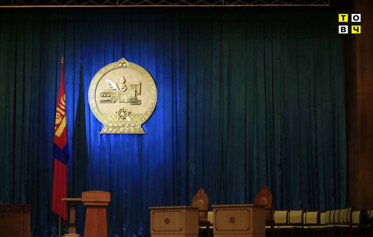 1.Төрийн ордны Их танхимын тайзны гүнд хөх цэнхэр дэвсгэр дээр Монгол Улсын Төрийн сүлд залж, түүний дэргэд баруун гар талд Монгол Улсын төрийн далбааг байрлуулсан байна. Төрийн далбааны дэргэд ам дөрвөлжин цагаан эсгий дэвсэж, хоёр талд Монгол Улсын төрийн ёслолын хүндэт харуулын цэрэг зогссон байна.
