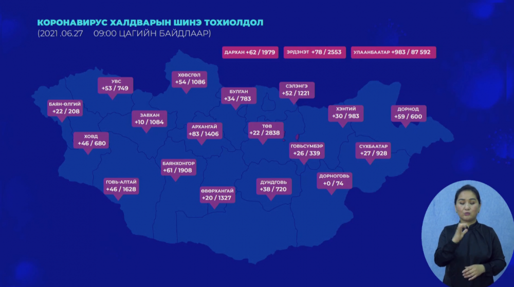 Батлагдсан тохиолдлуудын 1983 нь Улаанбаатарт, 823 нь орон нутагт илэрсэн байна. Ингэснээр Монгол Улсад батлагдсан халдварын нийт тохиолдол 111505, нас баралт 533 хүрч байна.