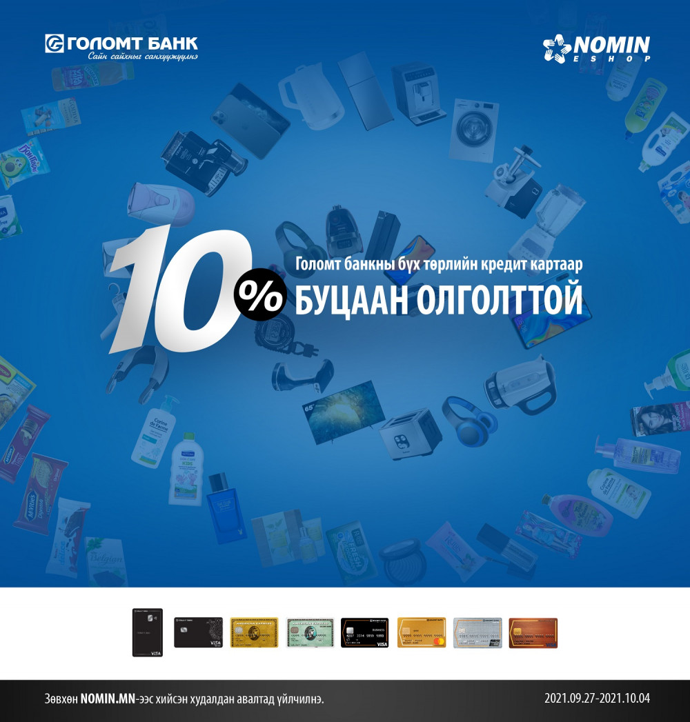 Голомт банк болон Nomin.mn хамтран 10 хувийн буцаан олголттой урамшууллыг зарлалаа. Тус урамшууллын хүрээнд Nomin.mn вэбсайтаас Голомт банкны бүх төрлийн кредит картаар худалдан авалт хийгээд нийт үнийн дүнгийн 10 хувийг буцаан авах боломжтой. Нэг харилцагчид олгох буцаан олголтын дээд хэмжээ 150,000 төгрөг ба буцаан олголтын урамшуулал 2021.10.08-ны дотор таны худалдан авалт хийсэн дансанд орох болно.