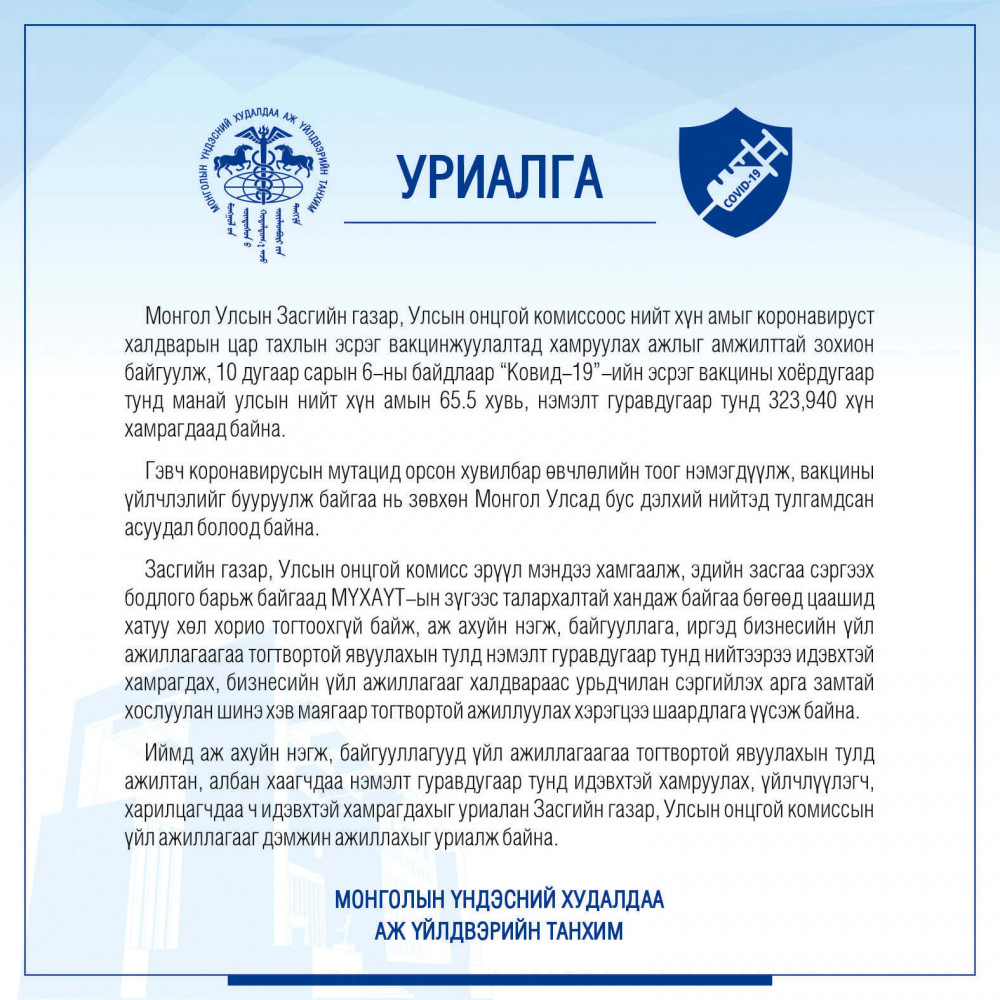 Иймд аж ахуйн нэгж, байгууллагууд үйл ажиллагаагаа тогтвортой явуулахын тулд ажилтан, албан хаагчдаа нэмэлт гуравдугаар тунд идэвхтэй хамруулах, үйлчлүүлэгч, харилцагчдаа ч идэвхтэй хамрагдахыг уриалан Засгийн газар, Улсын онцгой комиссын үйл ажиллагааг дэмжин ажиллахыг уриалж байна" гэсэн байна.