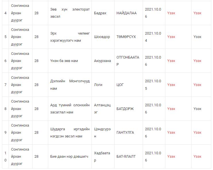 | 1 | Монгол ардын нам | 2021.10.06 | Үзэх | |