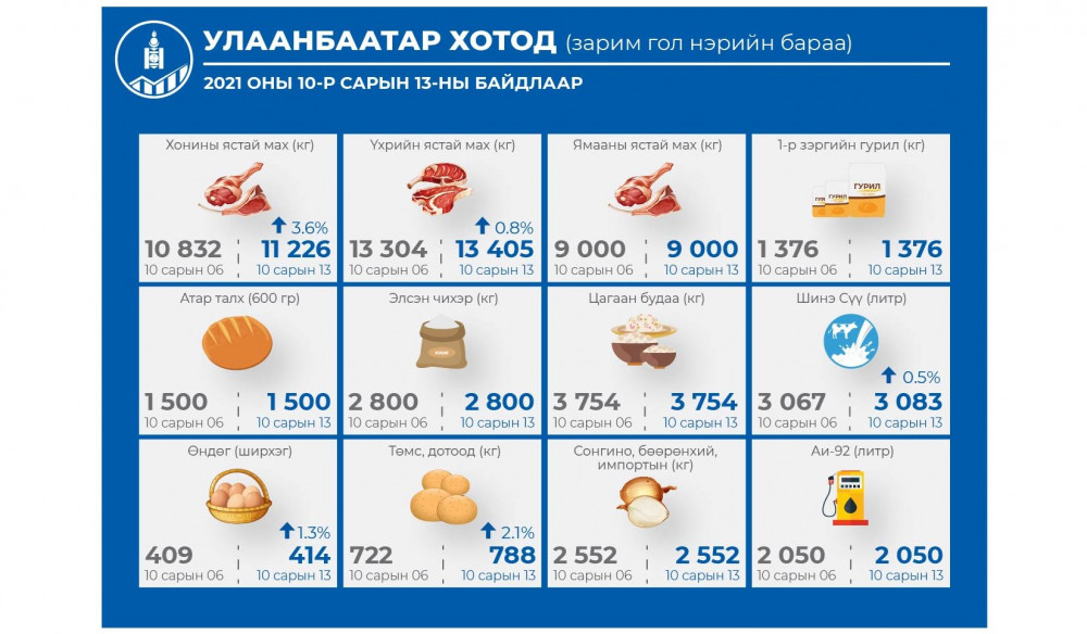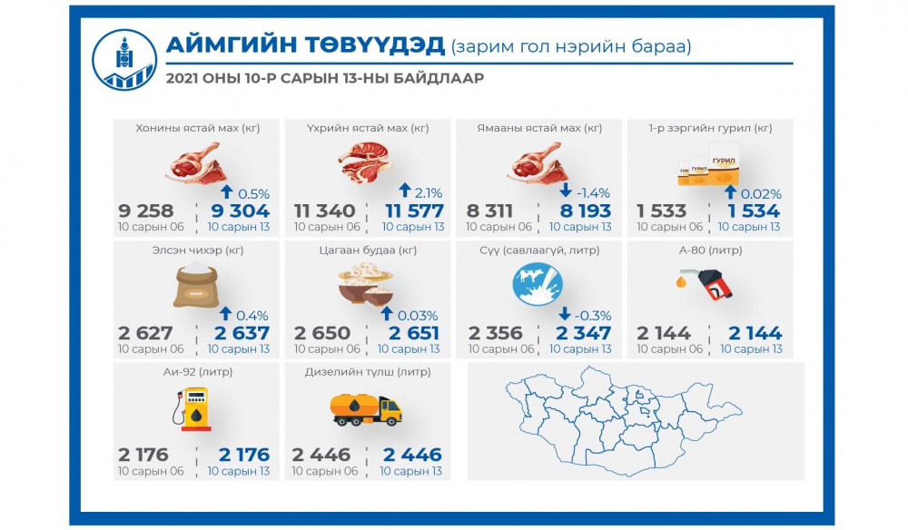 2021 оны 10 дугаар сарын 13-ны байдлаар аймгийн төвүүдэд зарагдаж байгаа зарим гол нэрийн барааны үнийг танилцуулж байна.