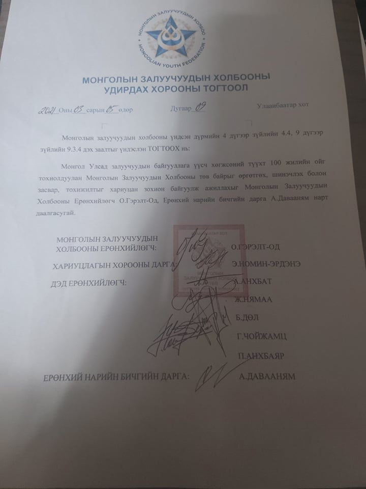 - МЗХ-ны 6 дугаар Их хурлаас баталсан дүрмийн дагуу 2021 оны 10 дугаар сарын 27-ны өдөр Үндэсний залуучуудын зөвлөлийн 3 дугаар хуралдаанаа хуралдуулсан. Гэвч манайд ажиллаж байгаад гарсан хэсэг залуучууд хурал хийж, бас нэг хүнийг Ерөнхийлөгчөөр сонгосон байна.
