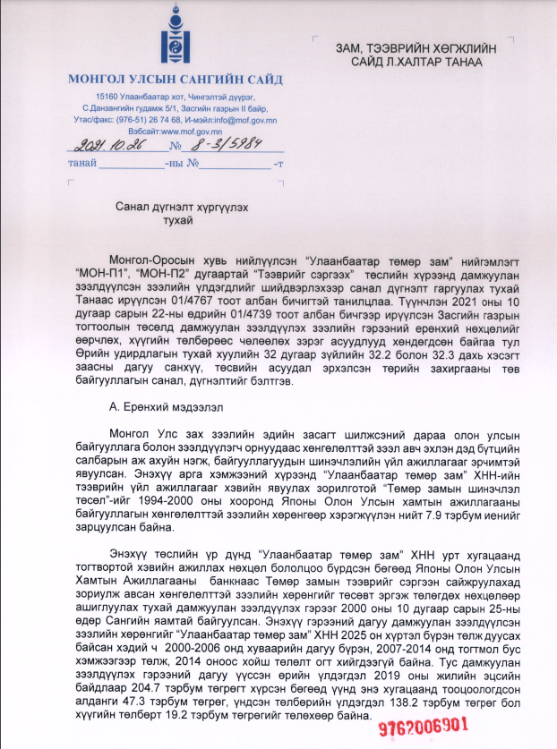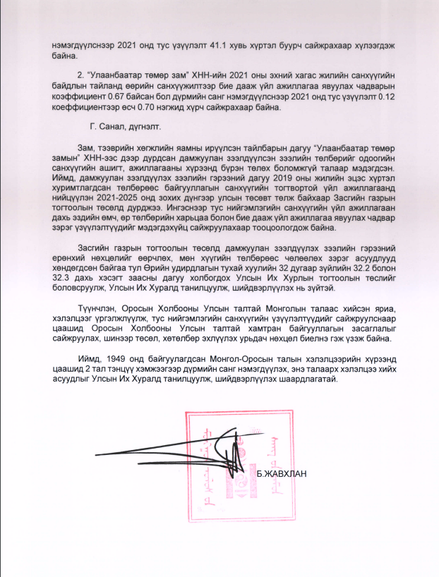 Түүнчлэн санал дүгнэлтэд Д.Тогтохсүрэнгийн ярьсанчлан УБТЗ ХНН-ийн зээлийн үлдэгдлийг Монгол болон ОХУ-ын талаас тэнцүү 83,7 тэрбум төгрөг гаргаж, дүрмийн санг нэмэгдүүлэх журмаар төлөхөөр тохиролцжээ. Гэхдээ УБТЗ ХНН бол төрийн өмчит компани. Төр төсвөөс мөнгө гаргаж, дүрмийн санг нэмэгдүүлж гэмээнэ хоёр талын тохиролцоо хүчинтэй болох учиртай. Харин энэ шийдвэрээ төсвөөс нэг ч төгрөг гарахгүй хэмээн тайлбарлаж байгаа нь хэтэрхий өрөөсгөл гэдгийг иргэд хэлж байна.