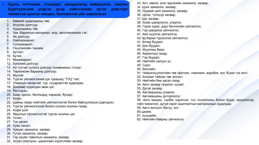 Нийслэлийн Засаг дарга бөгөөд Улаанбаатар хотын захирагчийн шийдвэрээр ирэх оны 1 дүгээр сарын 1-нээс эхлэн хууль тогтоомж, стандартад нийцүүлэн зөвхөн бүртгүүлсний үндсэн дээр нийслэлийн нутаг дэвсгэрт 74 аж ахуйн үйл ажиллагааг чөлөөтэй эрхлэх нөхцөл, боломжийг нээхээр болжээ.