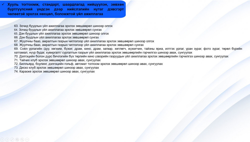 Зөвшөөрөл шаардахгүй болж буй 74 аж ахуйн үйл ажиллагааны чиглэлийг танилцуулж байна.