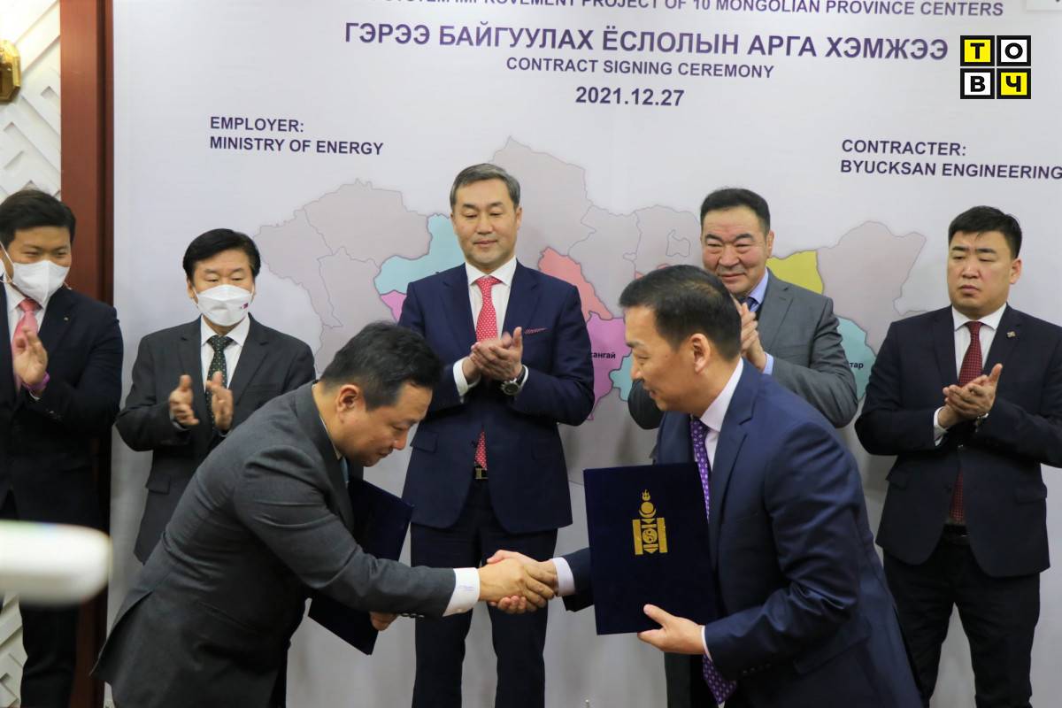 Баянхонгор, Говь-Алтай, Говьсүмбэр, Завхан, Өвөрхангай, Сүхбаатар, Хэнтий зэрэг 7 аймгийн төвд хэрэгжих төслийн барилга угсралтын ажил эхэлж, талууд өнөөдөр /2021.12.27/ гэрээнд гарын үсэг зурлаа. Гарын үсэг зурах ёслолд Монгол Улсын Эрчим хүчний сайд Н.Тавинбэх, БНСУ-аас Монгол Улсад суугаа бүрэн эрхт Элчин сайд Ли Ё Хун, Эрчим хүчний яамны Төрийн нарийн бичгийн дарга Б.Насантогтох, БНСУ-ын Экспорт Импорт банкны Монгол дахь суурин төлөөлөгч И Дун Хён, “Бюксан инженеринг” компанийн гүйцэтгэх захирал Ким Дон Вон болон бусад албаны хүмүүс оролцлоо.