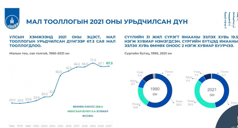 Мал, тэжээвэр амьтад, хашаа, худгийн тооллогын 2021 оны урьдчилсан дүнг өнөөдөр ҮСХ-ноос танилцууллаа. Улсын хэмжээнд энэ оны эцэст 67.3 сая толгой мал тоологдсон ч өмнөх оныхоос 268.4 мянгаар буюу 0.4 хувиар өссөн үзүүлэлт аж. Мал тооллогын урьдчилсан дүнгээр: