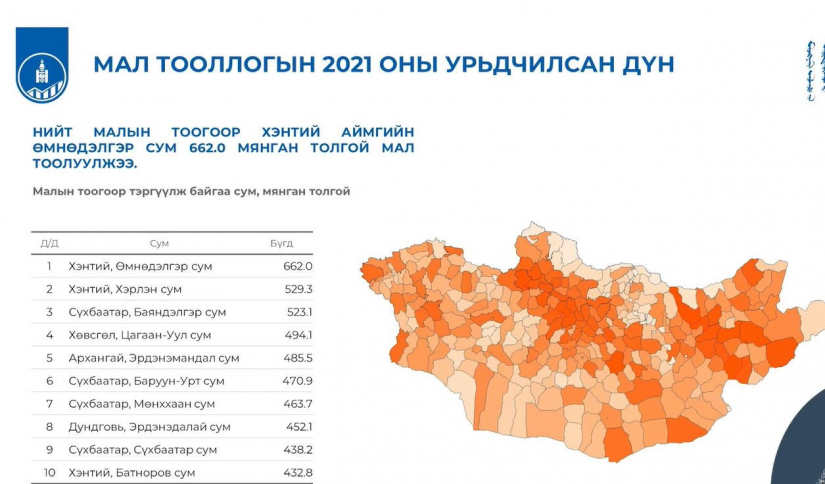 Хамгийн олон малтай сумдыг дурдвал: Нийт малын тоогоор Хэнтий аймгийн Өмнөдэлгэр сум 662.0 мянга, Хэнтий аймгийн Хэрлэн сум 529.3 мянга, Сүхбаатар аймгийн Баяндэлгэр сум 523.1 мянга, Хөвсгөл аймгийн Цагаан-Уул 494.1 мянга, Архангай аймгийн Эрдэнэмандал сум 485.5 мянга мал тоолуулж малын тоогоор тэргүүлжээ.