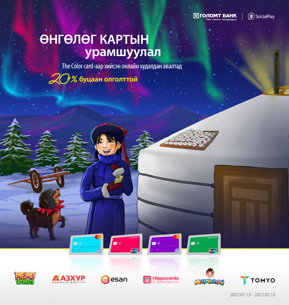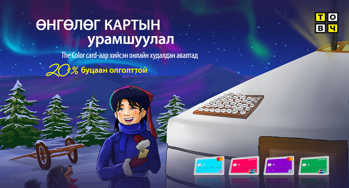 The Color Card хүүхэд, багачуудын өвлийн амралтад зориулан буцаан олголттой урамшуулалт хөтөлбөрийг зарлаж байна. The Color Card-ийн эрхэм харилцагч та картаа ашиглан дараах сонгогдсон вэбсайтуудаас онлайнаар худалдан авалт хийж 20###/span#<-ийн буцаан олголт авах боломжтой боллоо.