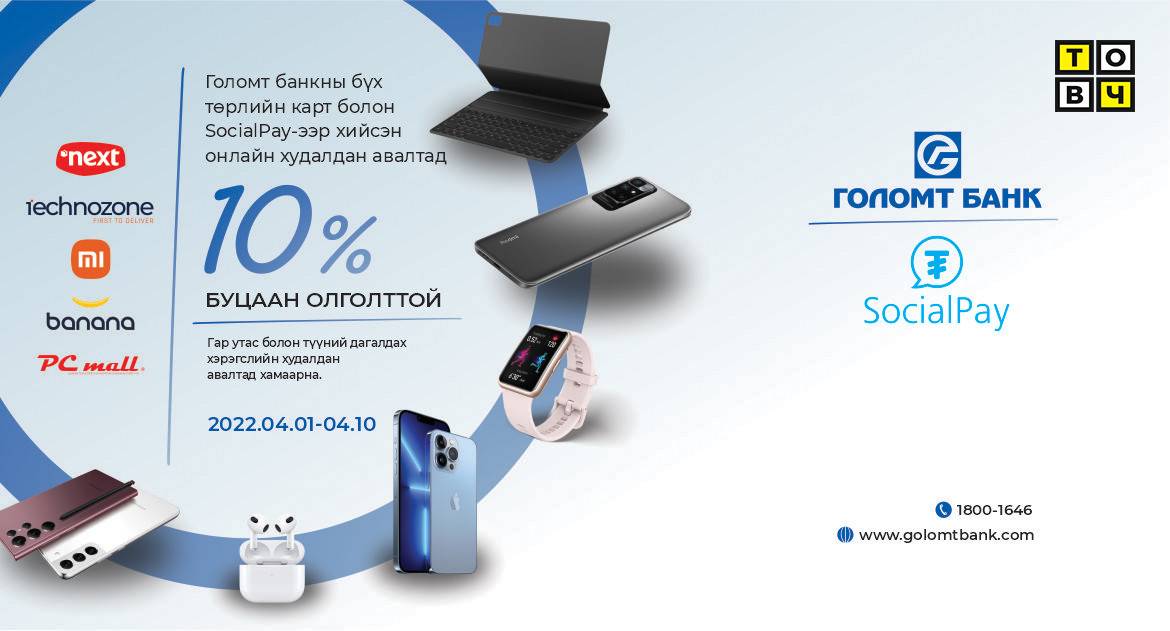 Голомт банк харилцагчдадаа зориулан ээлжит картын урамшууллаа зарлаж байна. Та сонгогдсон онлайн худалдан авалтын вэбсайтуудаас гар утас болон түүний дагалдах хэрэгсэл худалдан аваад 10% буцаан олголт аваарай. Харин төлбөрөө заавал Голомт банкны картаар эсвэл SocialPay аппликэйшн ашиглан хийсэн байх шаардлагатайг анхаарна уу.
