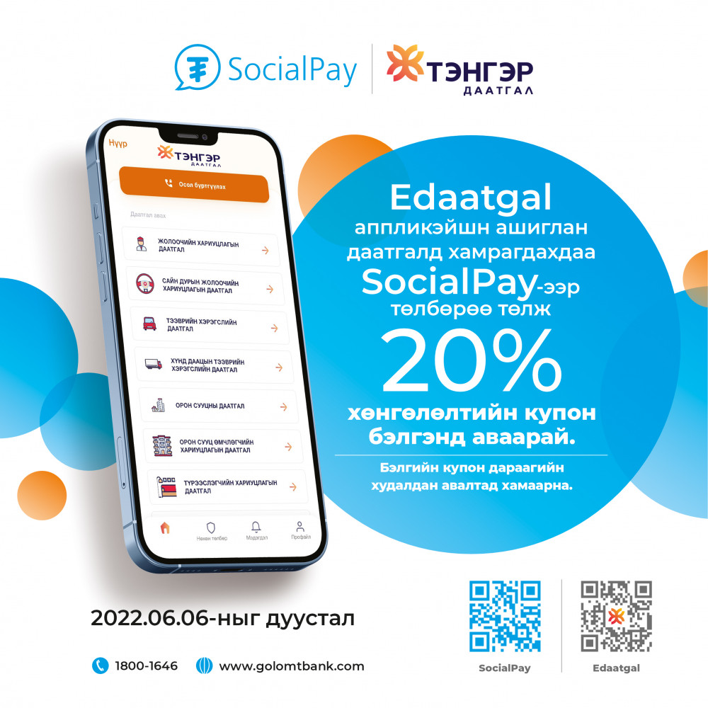 SocialPay аппликэйшн, Тэнгэр Даатгал ХХК хамтран даатгалаа дижиталаар авах боломжийг хэрэглэгчдэдээ олгож байна. Харилцагч та Тэнгэр Даатгал ХХК-ийн “Edaatgal” аппликэйшнийг ашиглан өөрт хэрэгтэй даатгалын үйлчилгээг авахдаа Socialpay дижитал хэтэвч ашиглан төлбөрөө төлөх боломжтой боллоо. Харин та 2022.06.06-ныг дуустал SocialPay аппликэйшнээр даатгалын төлбөрөө төлсөн тохиолдолд хүссэн даатгалаа 20%-ийн хөнгөлөлттэй авах купон бид бэлэглэх болно.
