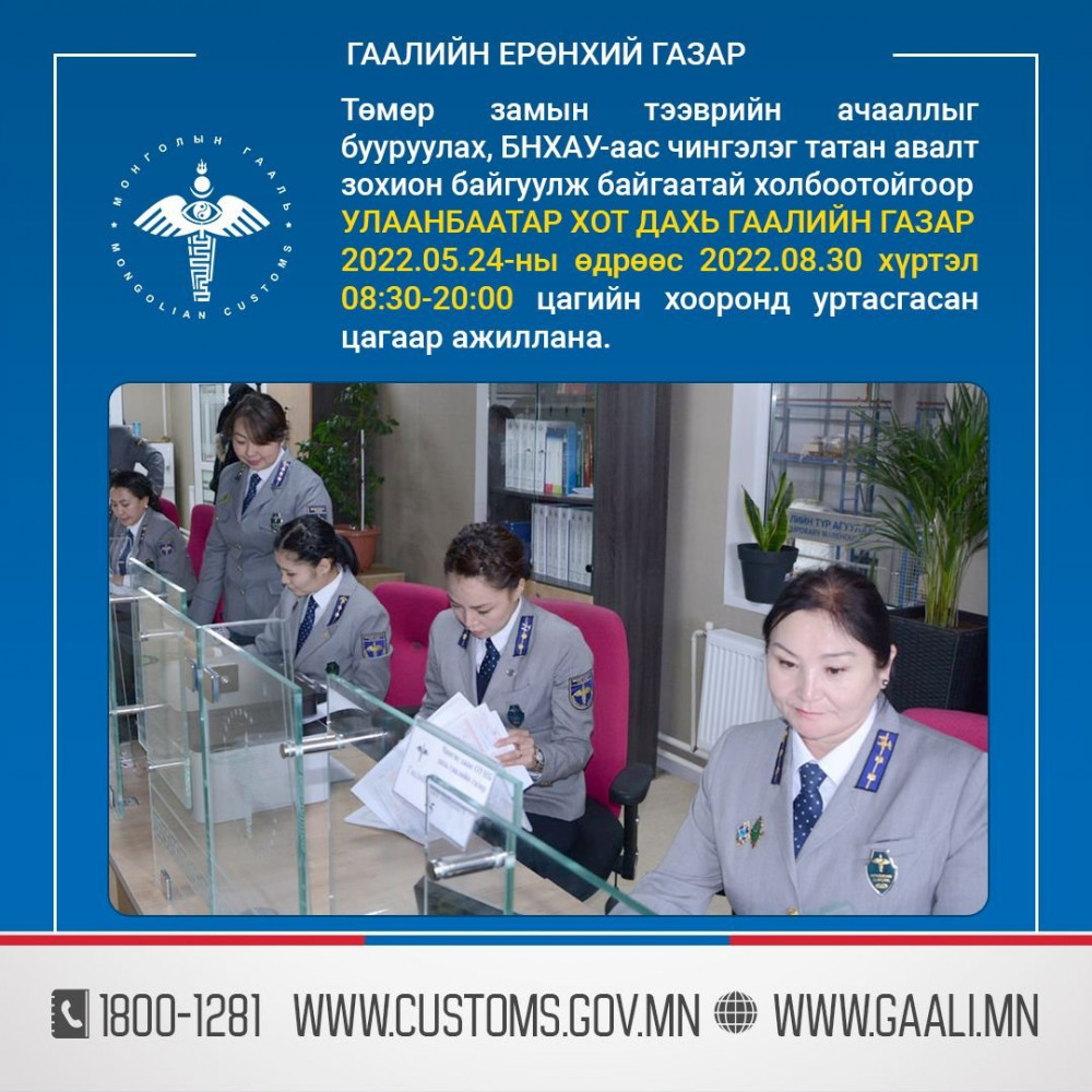 Улаанбаатар хот дахь Гаалийн ерөнхий газар уртасгасан цагаар ажиллаж эхэлжээ. Тодруулбал, тус газар тавдугаар сарын 24-ний өдрөөс эхлэн 08.30-20.00 цагийн хооронд ажиллахаар болсон байна. Энэ нь төмөр замын тээврийн ачааллыг бууруулах, БНХАУ-аас чингэлэг татан авалт байгуулж буйтай холбоотой бөгөөд энэ оны наймдугаар сарын 30-ныг хүртэл дээрх цагийн хуваариар ажиллана гэж Гаалийн ерөнхий газраас мэдээллээ.