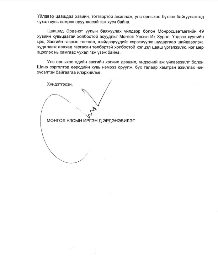 ХХБ-ны ТУЗ-ийн дарга Д.Эрдэнэбилэг Ерөнхий сайдад захидал бичжээ. Тус захидлыг хүргэж байна.