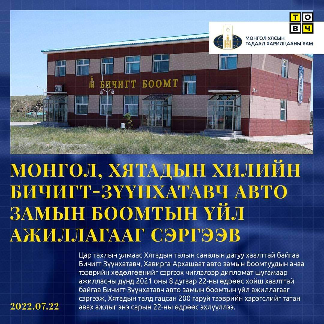 Цар тахлын улмаас Хятадын талын саналын дагуу хаалттай байгаа Бичигт-Зүүнхатавч, Хавирга-Архашаат авто замын боомтуудын ачаа тээврийн хөдөлгөөнийг сэргээх чиглэлээр дипломат шугамаар ажилласны дүнд 2021 оны 8 дугаар 22-ны өдрөөс хойш хаалттай байгаа Бичигт-Зүүнхатавч авто замын боомтын үйл ажиллагааг сэргээж, Хятадын талд гацсан 200 гаруй тээврийн хэрэгслийг татан авах ажлыг энэ сарын 22-ны өдрөөс эхлүүллээ.