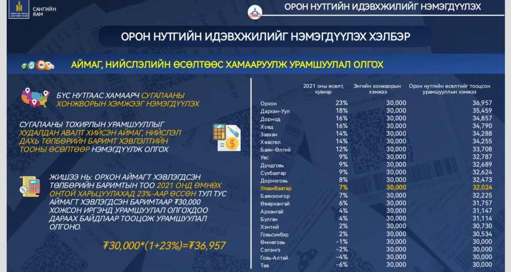 - Түүнчлэн орон нутгаас хамаарч сугалааны хонжвор дээр нэмэлтээр урамшуулал бодогдоно. Өөрөөр хэлбэл худалдан авалт хийсэн аймаг, нийслэл дэх төлбөрийн баримт хэвлэлтийн тооны өсөлтөөр урамшууллыг нь нэмэгдүүлж олгоно. 2021 оны байдлаар, Орхон аймгийн төлбөрийн баримт хэвлэлт нь 23 хувиар өссөн. Орхон аймгийн иргэн 30 мянган төгрөгийн азтан болбол хонжвор нь 23 хувиар нэмэгдэж, 36957 төгрөг авна гэсэн үг. Азтан шалгаруулахдаа И-баримт аппликнйшн ашиглан тохирлыг шууд үзэх боломжтой. Ингэхдээ таны баримтуудаас хэдэн тоо тохиролд таарсан, хэдэн төгрөг хожих боломжтой зэргийг мэдэх боломжийг хэрэглэгчдэдээ олгоно.