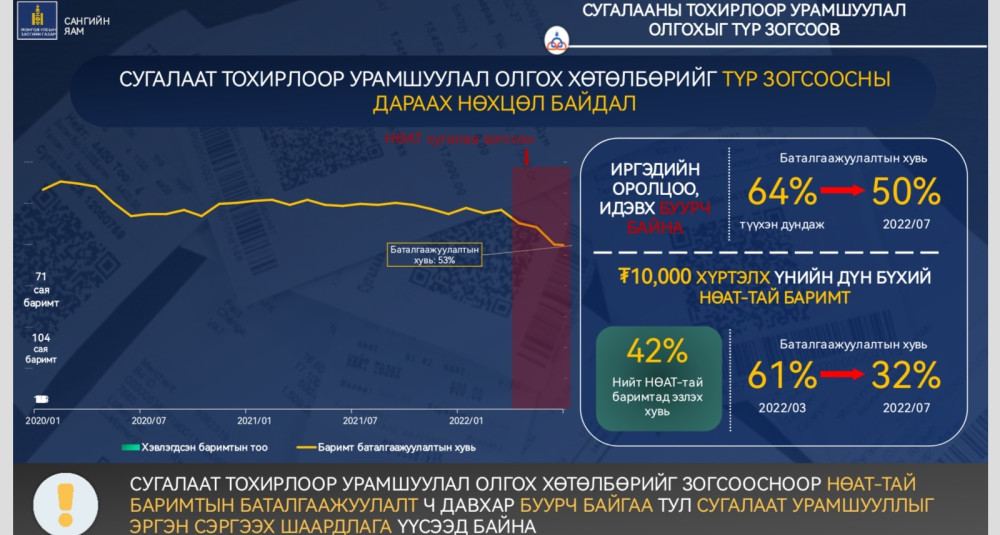 - Манай улсын 2.1 сая иргэн гар утаснаасаа и-баримтаа бүртгүүлдэг. Сард 1 сая орчим баримт хэвлэгддэгээс 10 орчим хувь нь НӨАТ-гүй баримтууд гардаг. Сугалааг зогсоосноос хойш баримтаа баталгаажуулдаг иргэдийн идэвх суларсан. Өмнө нь 100 баримт тутмын 70 нь баталгааждаг байсан бол сүүлийн үед 50 болж буурсан. Тиймээс ирэх сараас сугалааны системээ шинэчилж, шинэ хувилбараар явуулахаар төлөвлөж байна. Өнгөрсөн хугацаанд иргэдээс НӨАТ-ын сугалааны талаар ил тод байдаггүй, итгэл үнэмшилгүй, өөрсдөө сугалаандаа хождог гэх шүүмжлэлүүд гарсан. Тиймээс бид нөхцөл байдалд дүгнэлт хийж, сугалааг аль болох ил тод явуулах, баримтаа идэвхтэй баталгаажуулдаг иргэдээ дэмжих тал дээр хувилбарууд боловсруулж ирэх сараас нэвтрүүлэхээр ажиллаж байна.