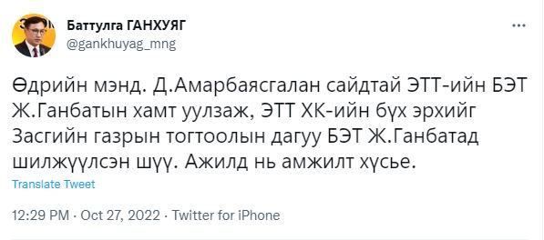 Б.Ганхуяг өөрийн цахим хуудаснаа "Д.Амарбаясгалан сайдтай ЭТТ-ийн БЭТ Ж.Ганбатын хамт уулзаж, ЭТТ ХК-ийн бүх эрхийг Засгийн газрын тогтоолын дагуу БЭТ Ж.Ганбатад шилжүүлсэн шүү. Ажилд нь амжилт хүсье" гэсэн байна.