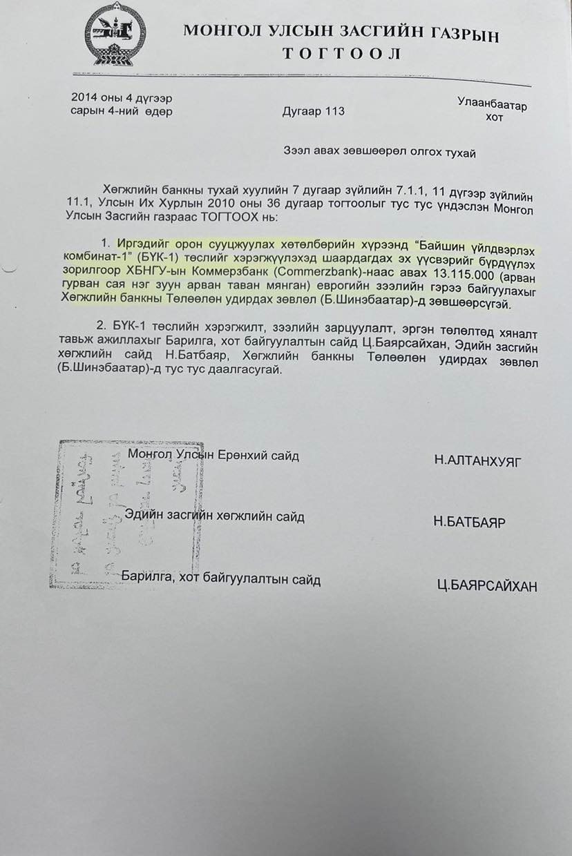 2015 оны 11 дүгээр сарын 14-нд 9 сая ам.долларын зээлийг 3 үе шаттайгаар авч, нийт 23 сая ам.доллар, 13 сая 47 мянган еврогийн зээлийг авчээ. Уг зээл одоогоор 3037 хоногийн хугацаа хэтэрсэн зээлийн гэрээний зөрчилтэй байна.