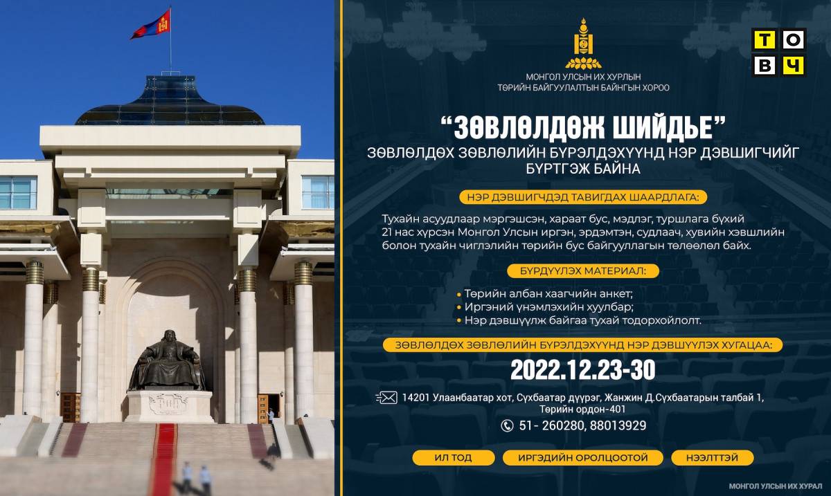 Бүртгэл: Зөвлөлдөх зөвлөлийн бүрэлдэхүүнд нэр дэвшигчийн материалыг 2022 оны 12 дугаар сарын 30-ны өдрийн 17:30 цаг хүртэл хүлээн авах ба Улсын Их Хурлын Төрийн байгуулалтын байнгын хороонд ирүүлнэ үү.