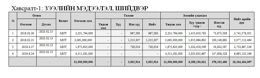 Харамсалтай нь 2023 оны 2 сард дуусгавар болох зээлийнхээ эргэн төлөлтөд “МБҮ Трейд” ХХК гуравхан сая төгрөг тушаажээ. Таван жилийн хугацаанд дөрвөн удаагийн гүйлгээгээр 11,5 тэрбум төгрөгийн санхүүжилт авчихаад гурван сая төгрөг төлнө гэдэг хэний ч инээдийг хүргэнэ. Гэвч энэ инээд нь тун удахгүй ханиад болох бололтой. МБҮ трейд ХХК-ний зээл өнөөдрийн байдлаар 11.5 тэрбум төгрөгийн үндсэн зээл, 6.4 тэрбум төгрөгийн үндсэн хүү, 376.3 сая төгрөгийн нэмэгдүүлсэн хүүгийн нийт 18.3 тэрбумд хүрээд байна.