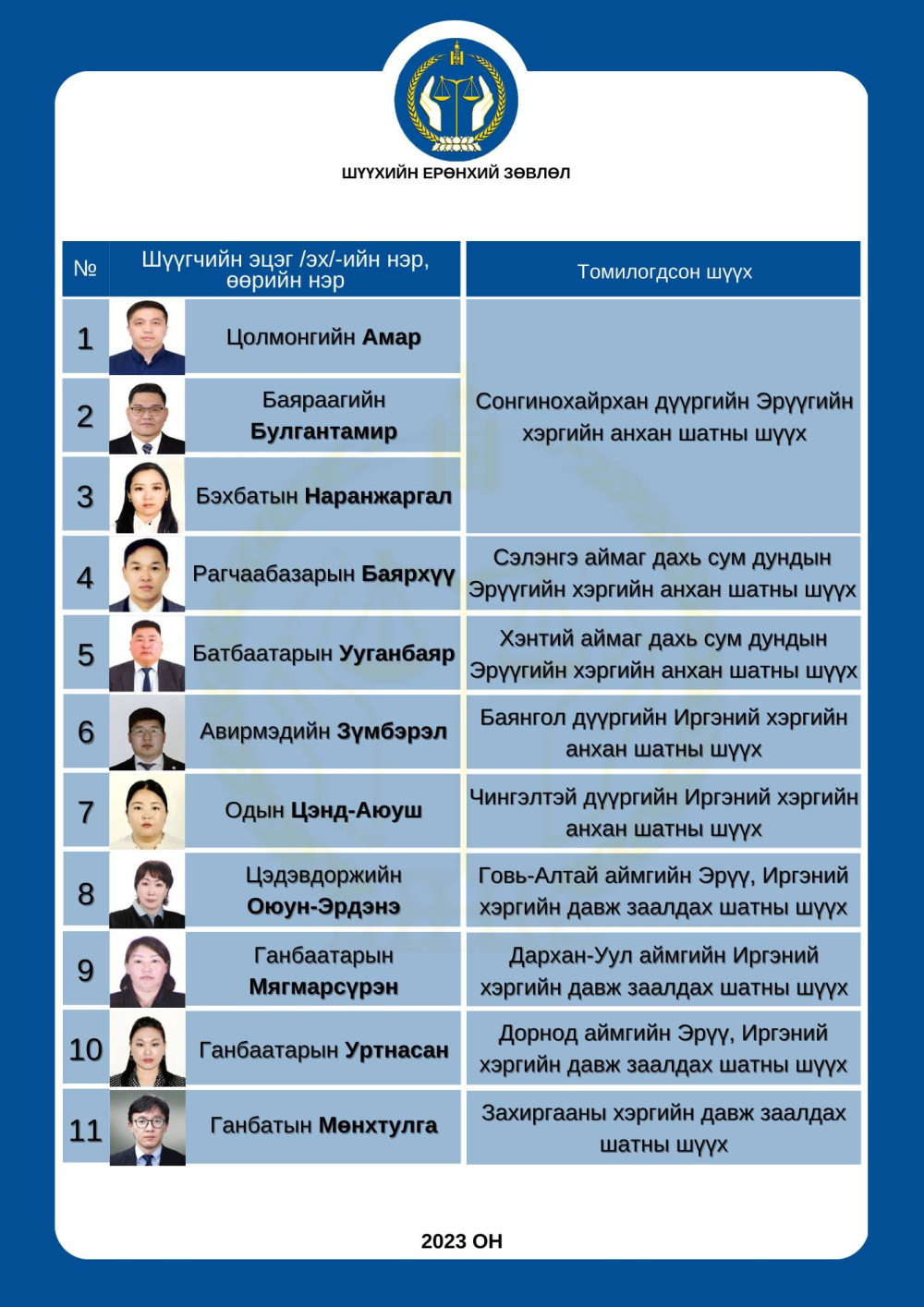 Монгол Улсын Ерөнхийлөгч 2023 оны хоёрдугаар сарын 17-ны өдөр зарлиг гарган дараах нэр бүхий 11 хуульчийг анхан болон давж заалдах шатны шүүхийн шүүгчээр томиллоо. Шинээр томилогдсон шүүгч нар тангаргаа өргөн, ажлаа хүлээн авч байна.