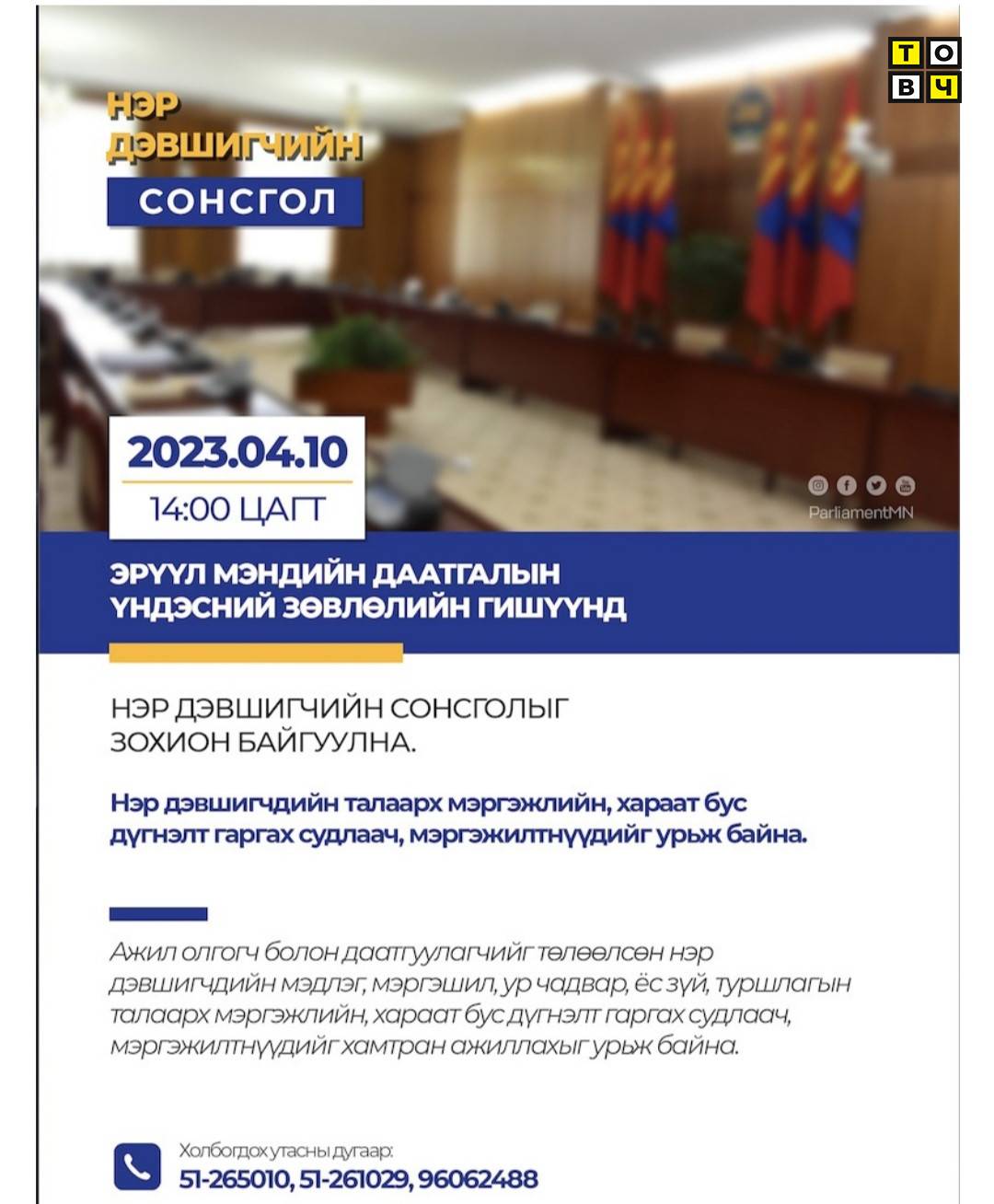 Улсын Их Хурлын Нийгмийн бодлогын байнгын хорооноос Эрүүл мэндийн даатгалын үндэсний зөвлөлийн гишүүнд нэр дэвшигчийн сонсголыг 2023 оны 04 дүгээр сарын 10-ны өдрийн 14:00 цагт Төрийн ордонд зохион байгуулна.