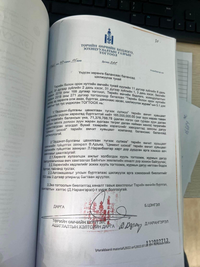Тиймээс Цемент шохой ТӨХК-ийн гүйцэтгэх захирал Л.Наранбаатар уг машиныг биет байдлаар буцаан эргүүлэн өгөх, өнгөрсөн хугацаанд уг автомашинтай холбоотой гарсан бүх зардал болох 12 сая төгрөгийг энэ сарын 15-ны дотор Ц.Баяр-Эрдэнээр компанид буцаан төлүүлж, Төрийн хэмнэлтийн тухай хуулийг хэрэгжүүлэхийг шаардсан байна.