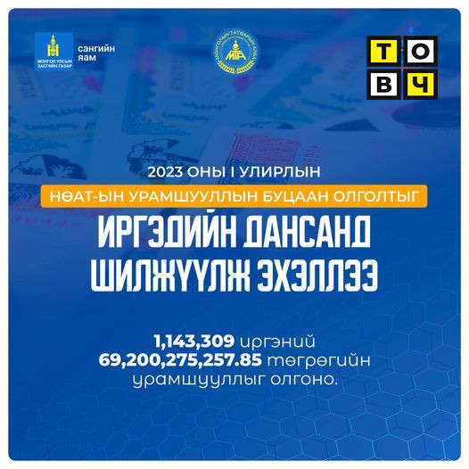НӨАТ-ын урамшууллын буцаан олголтыг иргэдийн дансанд шилжүүлж эхэллээ. Татвар төлөгч 1,143,309 иргэнд 69.2 тэрбум төгрөгийн урамшуулал олгоно.