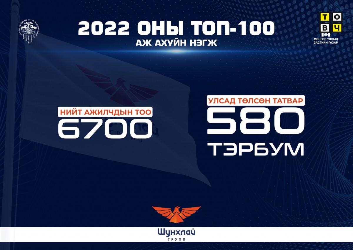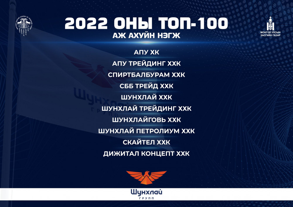 Монгол Улсын Засгийн газар, Монголын үндэсний худалдаа аж үйлдвэрийн танхим хамтран жил бүр нийгэм, эдийн засагт жинтэй хувь нэмэр оруулсан “Топ 100” аж ахуйн нэгжийг /ААН/ шалгаруулдаг уламжлалтай. Уг уламжлалын дагуу өнөөдөр /2023.05.18/ "Топ-100" ААН-ийг танилцуулав.