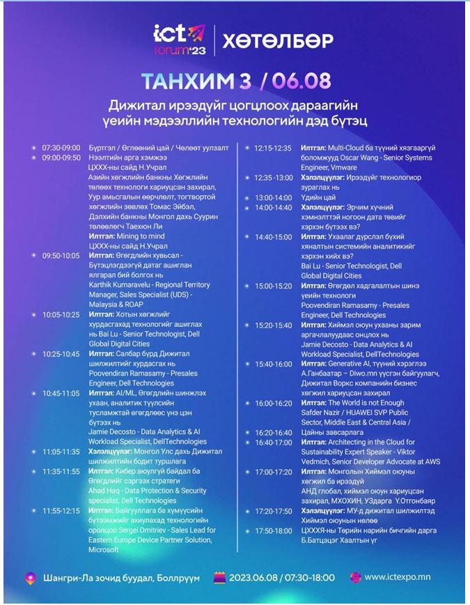 2023 оны 06 дугаар сарын 08-ны өдөр “ICT FORUM MINDGOLIA 2023” -ын танхим 3-т болох үйл ажиллагаанд оролцон дараах оролцогчид “Кибер аюулгүй байдал ба өгөгдлийг сэргээх стратеги” болон “Байгууллага ба ажилчдын бүтээмжийг ахиулахад технологийн оролцоо” зэрэг салбарын чухал сэдвүүдийн хүрээнд хэлэлцүүлэг өрнүүлнэ.